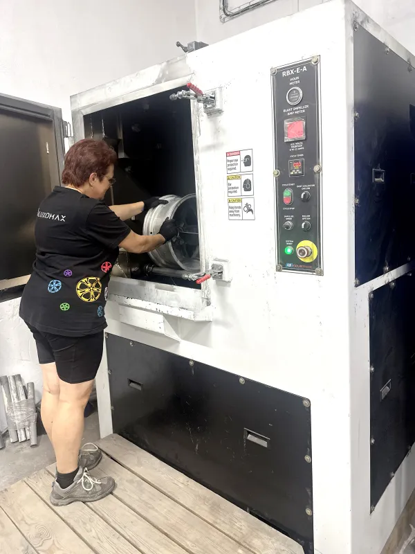 Každou nalakovanou sadu ALU disků pečlivě kontrolujeme. Malé nedokonalosti jemně dočistíme, při větším defektu disk vracíme zpět do procesu. Zároveň čistíme dosedací plochu na náboj a nakonec disky balíme do ochranné folie.